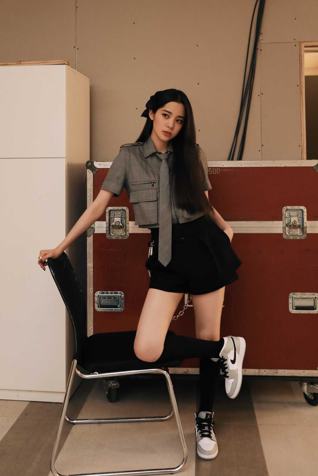 年轻女孩更适合一些充满年轻气质的服饰,比如下面的衬衫搭配黑色半身裙,看起来很简单,但其实充满了设计感。黑色半身裙和黑色中筒袜的搭配还可以修饰双腿,女团风十足,这种造型非常适合年轻的姐妹尝试哦。